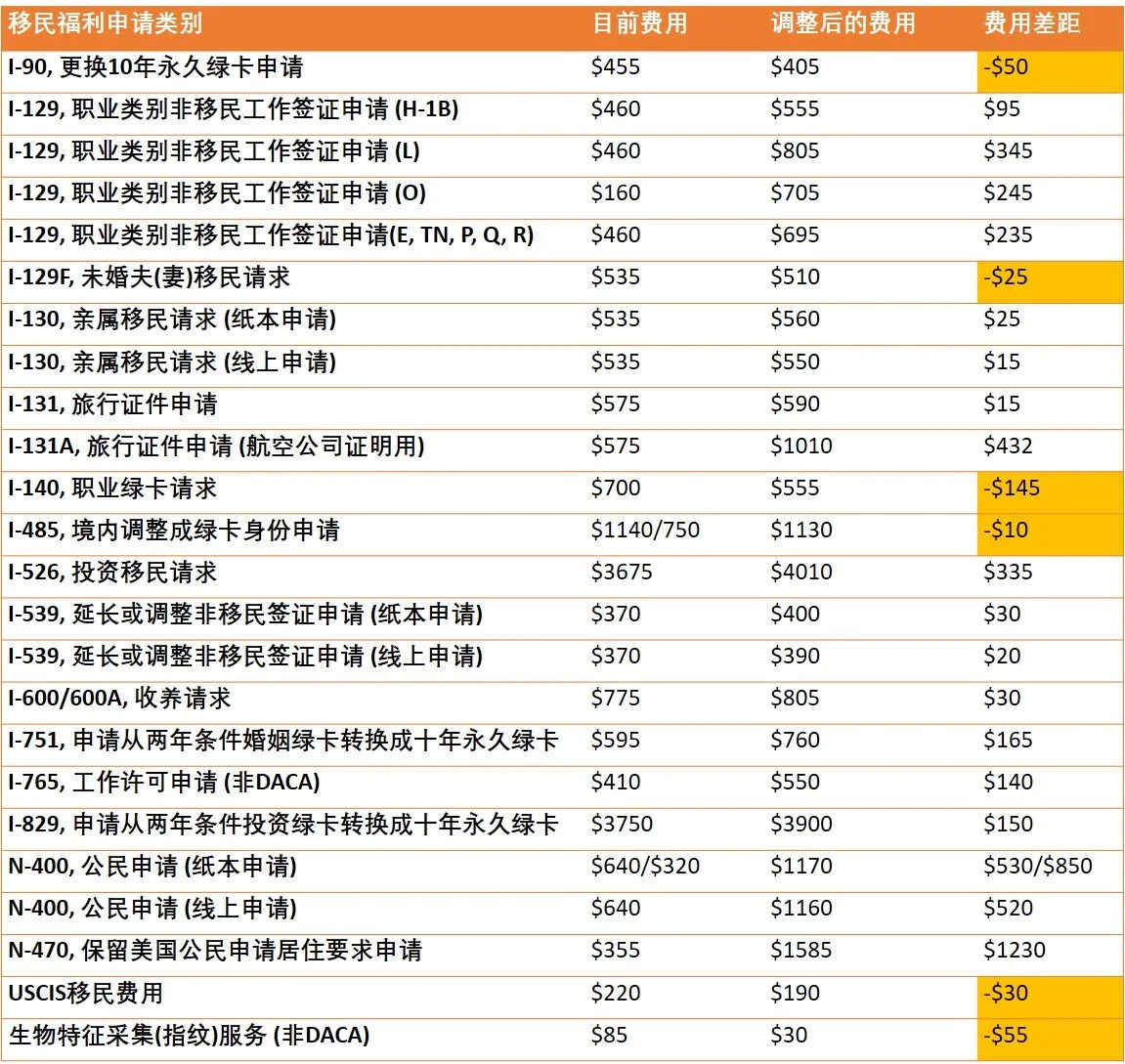以下是移民局费用调整的比较表: