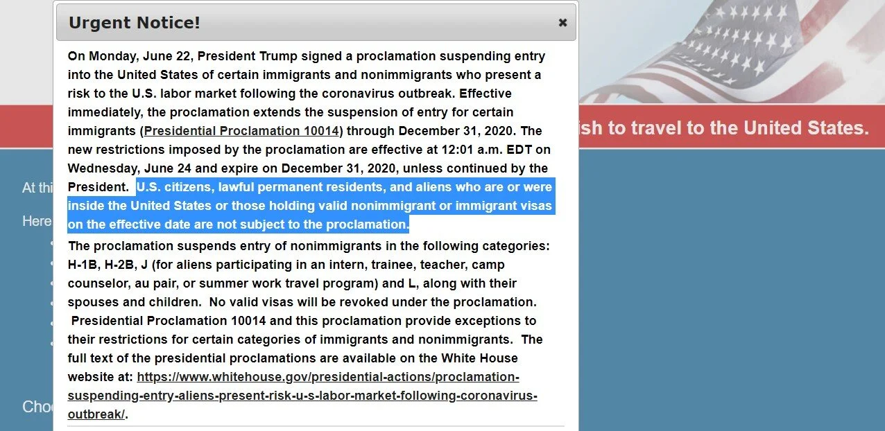 “If you depart the US, you will need a valid visa to return and we will not be issuing H-1B, H2B, L, or certain J visas, and their derivatives through December 31, unless an exception applies.” (换言之,不管禁令生效时你人在哪边,或是有没有签证,我们一.。律。不。发。签。证!)